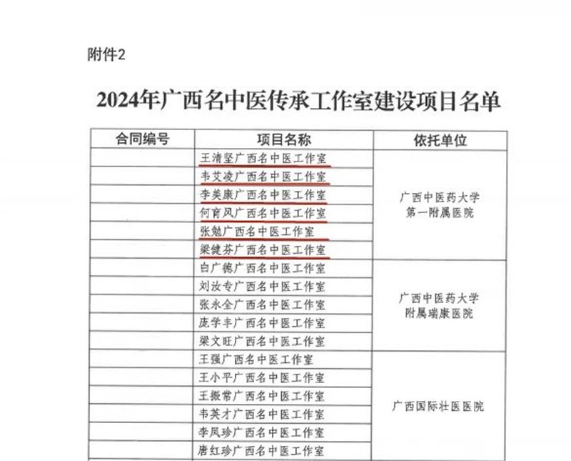 一附院4名第二届桂派中医大师姚春、黄贵华、谢胜、刘泰,6名广西名中医王清坚、韦艾凌、李美康、何育风、张勉、梁健芬获自治区专项资金支持建设传承工作室,建设期3年。