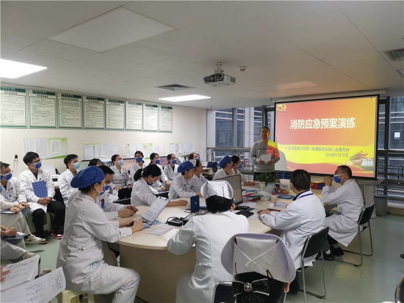 在春节来临之际,为提高一附院仙葫院区心血管内科医务人员的消防安全意识和应对突发火灾自救互救能力。1月19日上午,一附院仙葫院区心血管内科联合后勤部在病区开展突发火灾应急演练活动。本次演练由科主任何新兵任总指挥,护士长陈启娟为副指挥,后勤部主任谭晓旭观摩指导,全科人员参加。