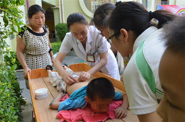 中医治未病中心医师为家长们演示小儿捏脊手法