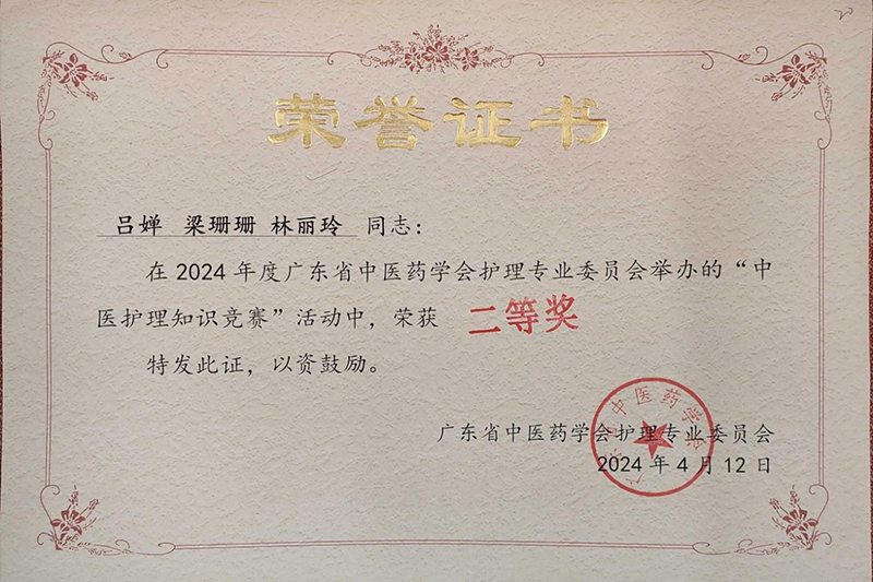 4月11-12日,由广东省中医药学会护理专业委员会举办的“中医护理知识竞赛”在广东省中医院举行。由附属瑞康医院治未病中心吕婵、林丽玲和中医经典病房梁珊珊三位护理人员组成的团队,经过两天的激烈角逐,荣获团队二等奖的佳绩。