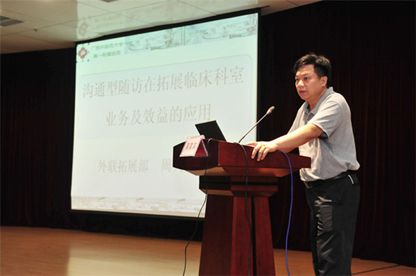 桂雄斌在培训班上作了《医患沟通型随访制度设计的基础理论》的主题演讲,桂雄斌副院长从当前的政策形势出发,结合目前一附院发展需求,从当前一附院随访制度设计及其误区以及一附院随访制度的设计原则和设计要点等方面着重介绍了医患沟通型随访制度设计的基础理论。广西名中医、康复科主任周宾宾作了《沟通型随访在拓展临床科室业务及效益的应用》的主题演讲,周主任从一个临床科室主任的角度出发,把临床科室如何开展随访、如何把随访工作做好,从而扩大临床科室的社会声誉、稳定和扩大患者群体,进而促进临床科室效益和知名度。外联拓展部主任韦义展作了《医患沟通型随访的流程和常见问题应对方法》的主题演讲,韦义展主任从随访工作机制的考察和制订、随访目的、随访人员构成、随访对象、随访类型、随访方式和内容、随访执行时间、随访结果、随访产生的问题及对策、随访工作的延伸等十个方面,向学员们进行了详细的介绍。护理部韦衡秋主任作了《沟通型随访的电话礼仪和注意事项》的主题演讲,韦衡秋主任以国家当前开展的改善医疗服务行动计划为落脚点,从电话礼仪、电话随访注意事项、电话随访内容等方面进行了介绍。信息科黄晓源工程师作了《随访系统使用介绍》的主题演讲,黄工程师从我院随访系统的背景、特点、主要功能、系统开发过程中遇到的问题等问题逐一向参会学员进行介绍。讲课结束后,各位主讲人员还针对参会代表的提问进行了解答。