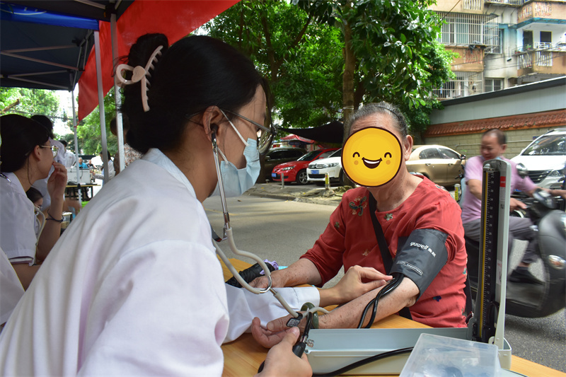 活动伊始,志愿者们有序地布置现场,吸引了许多居民前来咨询。活动中,志愿者们身穿统一红马甲耐心地为居民们测量血压、手法按摩、艾灸等。现场还科普了基本急救知识,一对一地讲解成人心肺复苏和婴儿海姆立克急救法的具体步骤,并邀请居民们进行现场操作。