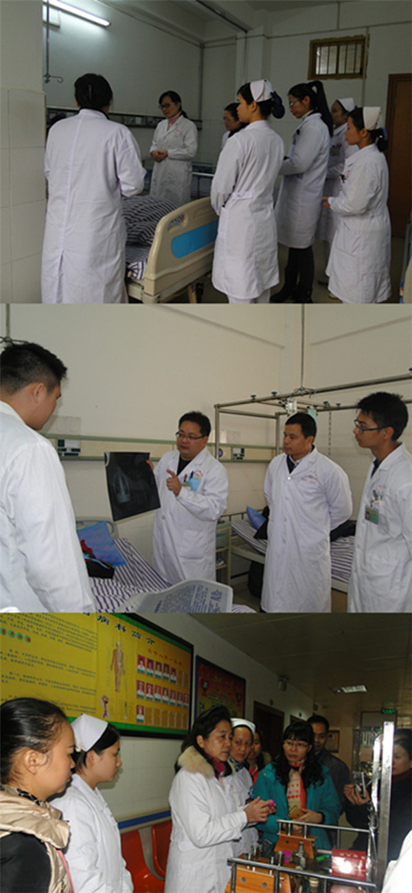随后举行了指导查房、惠民义诊、专题讲座等技术交流活动。风湿向彩春主任医师、妇科余丽梅副主任医师、骨科陈劲副主任医师在县中医院有关科室进行了三级查房指导,结合具体病例对有关专科进行了专业技术、科室建设、学科建设等方面的指导。随后,由卢健棋副院长带领,康复科周宾宾、风湿科向彩春、外五科李杰辉、肝病科黄晶晶、心胸外科韦懿桐、儿科李志峰等专家在宁明县中医院老院区进行了惠民义诊,约200名群众在当地就能享受到省级三甲医院专家的优质诊疗服务。脾胃病科护士长吕艳对当地护理人员进行中医特色护理诊疗培训。