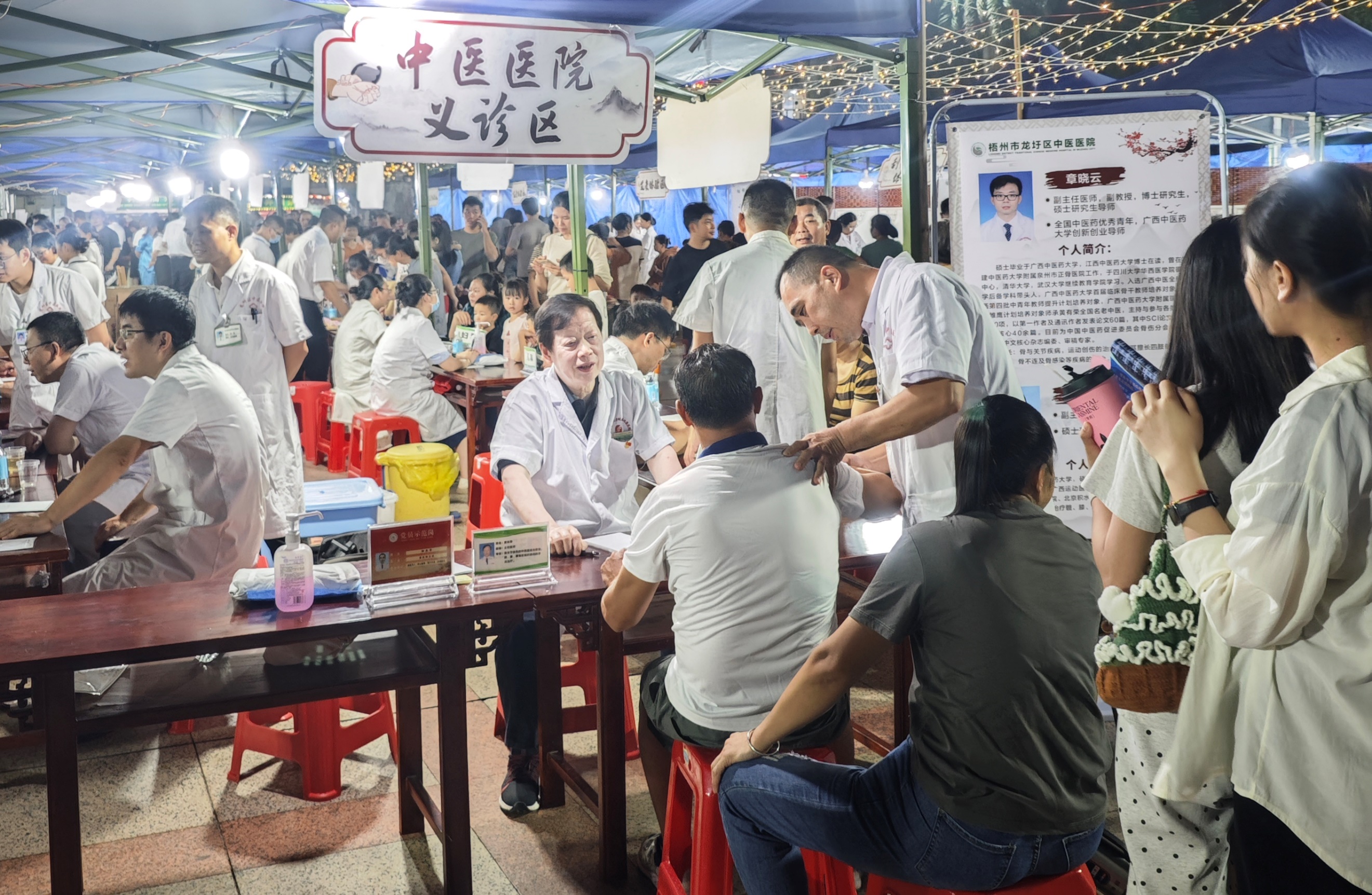 10月19日晚,黄有荣教授及其团队成员朱江龙主任医师、章晓云副主任医师、丰新健副主任医师以及蓝崇主治医师,参加梧州市龙圩区中医文化之夜义诊活动。专家团队为居民群众问诊号脉、体质辨识、辨证开方,并给予个体化的中医治疗和调理指导。活动从19时开始,原本计划21时30分结束,但由于前来就诊人数较多,黄有荣教授不间断地为群众看病至深夜23时多,诊疗服务人数达100余人。
