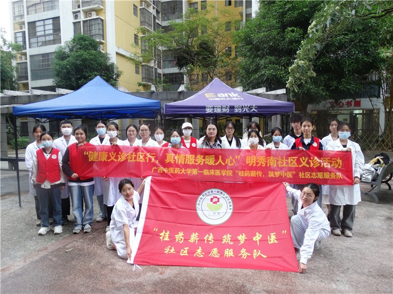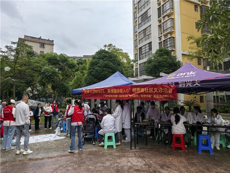 为推动志愿服务活动项目化、常态化开展,第一附属医院团委、社工部组建“桂药薪传,筑梦中医”社区志愿服务队,开展秋季学期的社区义诊活动。10月27日,志愿服务队来到广西南宁市明秀南社区开展“健康义诊社区行,真情服务暖人心”活动,共计30名青年志愿者参加。
