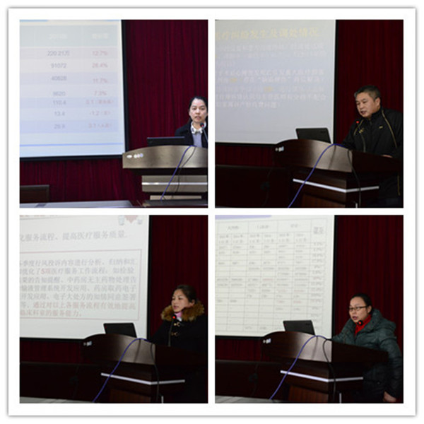会上,医务部副主任黄依兰、医患办副主任李军、行风办副主任钟新兰、护理部副主任周艳琼、感染管理科副主任赵莹、原医保办主任李启荣、输血科主任潘爱萍、药学部副主任杨正腾、预防保健科主任蒙美禄,分别就全院2015年度医疗质量工作、医疗安全工作、行风建设管理工作、护理质量管理工作、医院感染管理监控工作、医保质量工作、临床用血管理工作、临床合理用药管理工作、疫情监测报告工作等运行情况进行了总结汇报,对存在缺陷进行了分析、评价,并提出了改进意见和建议。