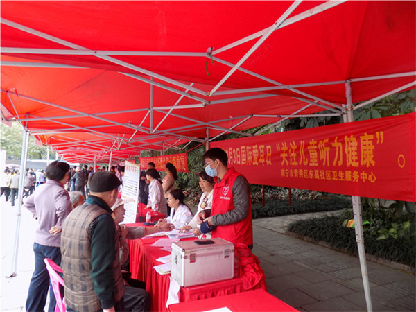 2016年3月3日是第17次全国“爱耳日”,也是第4次“国际爱耳日”。为了普及听力健康科学知识,提高人民群众爱耳、护耳意识,减少听力残疾的发生,提高我辖区广大居民朋友听力障碍预防和康复工作,一附院东葛社区卫生服务中心联合广西优生优育协会、南宁市卫生和计划生育委员会、青秀区卫生和计划生育局、广西医科大学第一附属医院、解放军303医院、区妇幼保健院、南宁市金花茶公园等单位于2016年3月3日上午9:00-11:30在南宁市金花茶公园开展大型健康义诊活动。