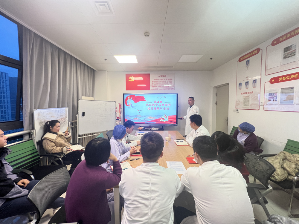 支部书记韦邦宁上专题党课,结合民族地区、民族医医院的特点,向党员们阐述铸牢中华民族共同体意识的重大意义与丰富内涵。同时,立足科室岗位要求,从做好健康服务的角度,引导党员思考外科医疗创新的必要性与方向、如何提升外科医疗服务质量、构建和谐医患关系等问题,并分享实践经验与成功案例。