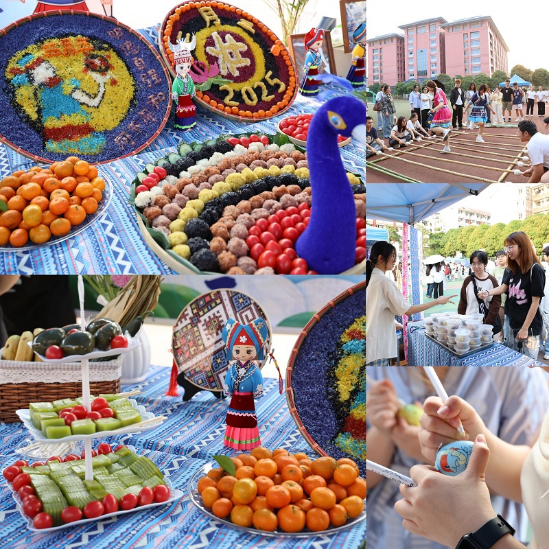 开幕式后是精彩纷呈的三月三主题体验活动。一顶顶帐篷前,众多师生排起长队,争相品尝五色糯米饭、斑斓糕、糍粑、青团、水果拼盘等特色美食,体会中华饮食文化的博大精深。师生们还踊跃体验“蒙眼寻锣记”“飞绣入篓”“欢乐套圈”“三人板鞋竞速”“三月三,铁环逐春”“彩蛋绘三月”“探秘三月三,盲盒抽知有礼”“壮乡百味宴”“竹韵舞动壮乡情”等民族文化活动,热闹非凡。