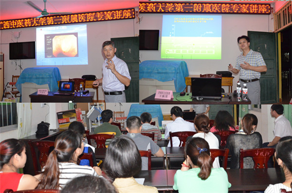 14日晚,一附院专家为凭祥市中医院全体医护人员以及周边卫生院医师进行了两场学术讲座。一附院消化内镜专家卢杰夫教授讲座专题为《消化内镜诊疗技术发展---从硬镜到单气囊小肠镜》,肝病科王振常教授讲座专题为《病毒性肝炎的规范抗病毒治疗方案和临床研究进展》。基层医护人员表示得到很大帮助、感受和触动很深,纷纷要求两位专家留电话,长期联系、请求指导。