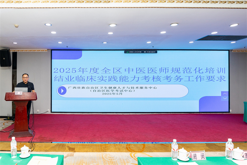 5月17日,由自治区中医药管理局主办、附属瑞康医院承办的2025年中医医师规范化培训结业考核临床实践能力考核考官能力培训班在南宁举办。自治区卫生健康委党组成员,自治区中医药管理局党组书记、局长黎甲文,自治区中医药管理局科技教育处处长杨艳光,自治区卫生健康人才与技术服务中心主任闭闵,附属瑞康医院院长、基地主任唐红珍,副院长古联出席开班仪式。本次培训采取线上、线下相结合的形式进行。来自全区各中医规培基地的230余名考官及考务人员参加现场培训,1000余人次在线上参会参训。