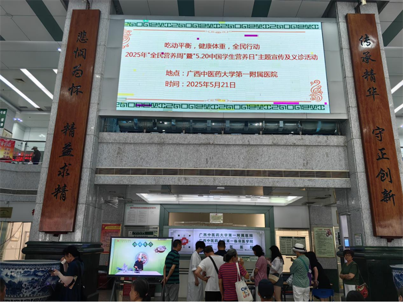 为贯彻落实《健康广西行动( 2020—2030 年)》《广西国民营养计划( 2017—2030年) 实施方案》,5月21日上午,第一附属医院医技药学党总支第三党支部联合仙葫院区党总支第二党支部在东葛院区门诊大厅开展2025年全民营养周暨“5.20”中国学生营养日主题营养宣传和多学科联合义诊活动。