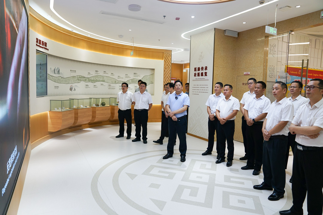 黄永伦一行先后到门诊大厅、院史馆、国医大师馆、治未病中心、药浴中心、中医(壮医)护理门诊、健康管理中心等处参观,详细了解医院建设发展、壮瑶药发展历程及医院体检中心发展情况,并通过观摩体验壮医水蛭疗法、壮医药物竹罐疗法、壮医药线点灸疗法,进一步了解壮瑶药在临床的广泛应用。