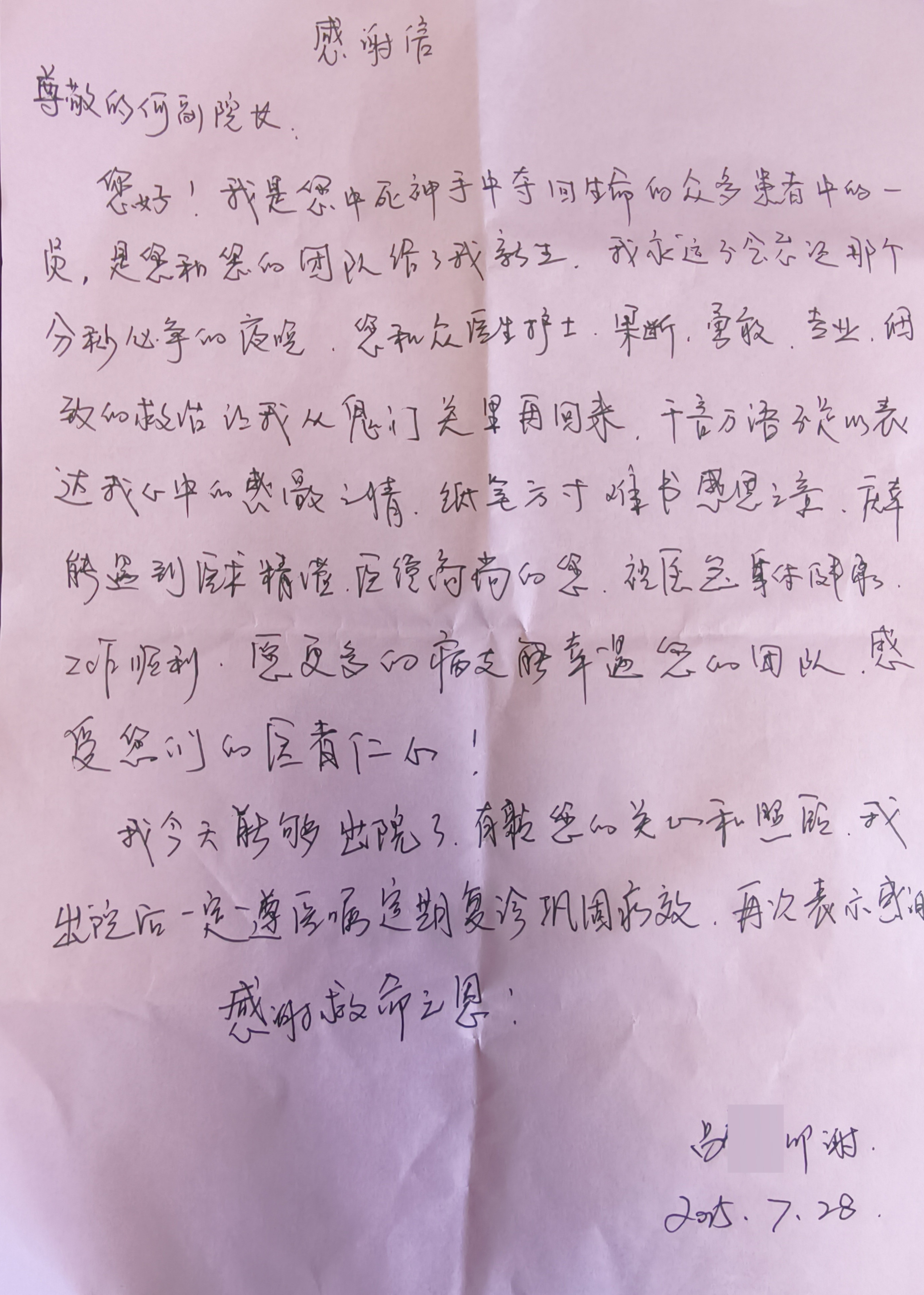 ▲出院当天患者写的感谢信