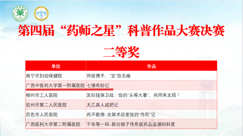 9月21日,第四届广西“药师之星”科普作品大赛在梧州市工人医院圆满落幕。第一附属医院药学部首次组队参赛即获佳绩,中药科普情景剧《七情奇妙记》荣获大赛二等奖。