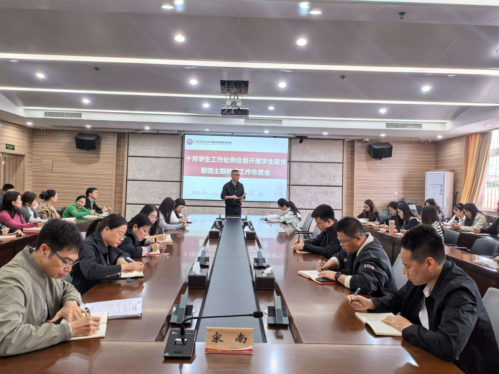为系统总结近期学生工作情况,并扎实部署下一阶段重点任务,特别是深入推进学生爱国爱党主题教育,赛恩斯新医药学院学生工作处于10月22日组织召开了十月学生工作例会暨学生爱国爱党主题教育工作布置会。赛院党委副书记宋南出席并作专题讲话,学生工作处处长谭入铚主持会议,学生工作处全体工作人员、辅导员参加会议。