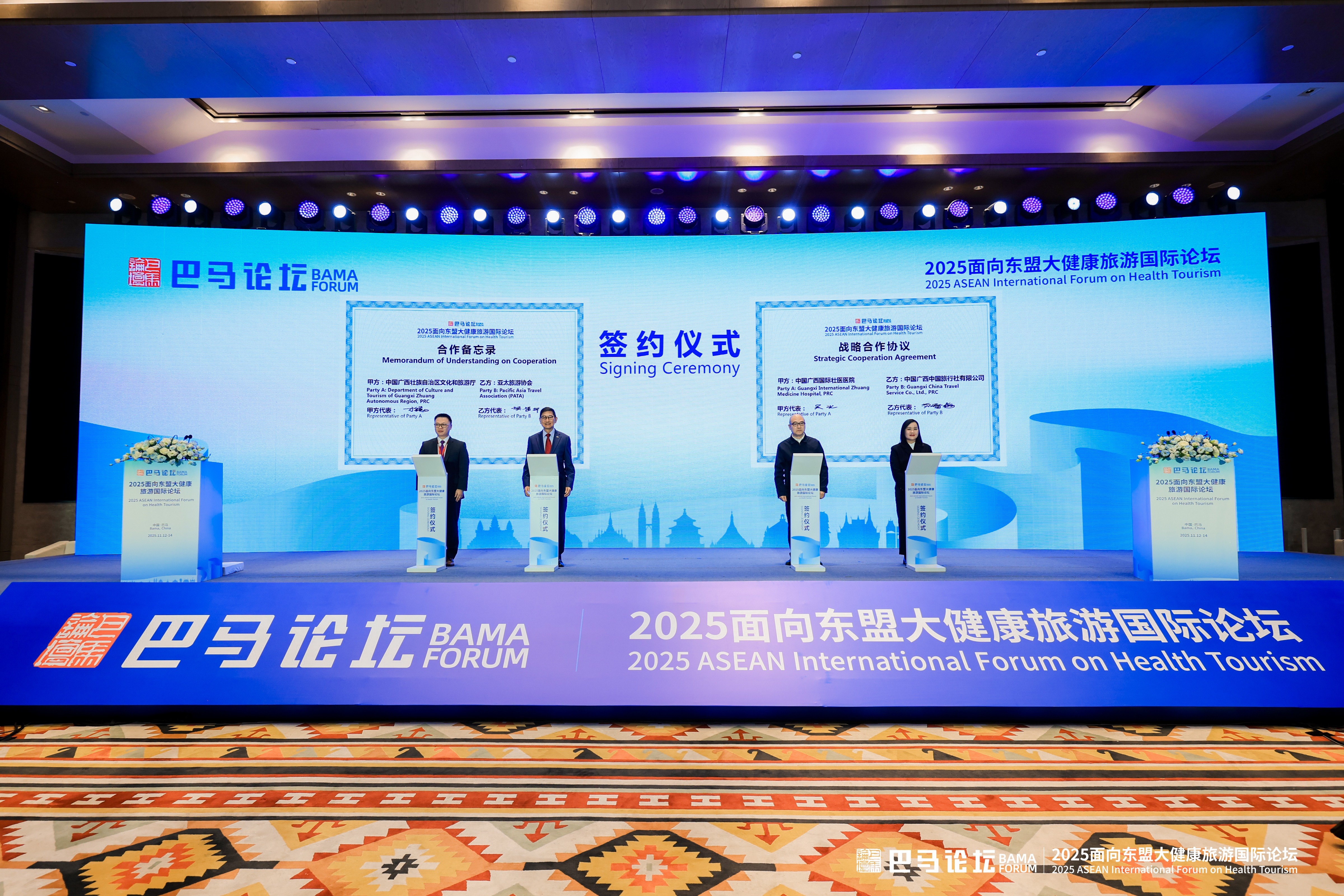 11月12日至14日,2025面向东盟大健康旅游国际论坛(以下简称“巴马论坛”)在世界长寿之乡广西巴马举行。论坛期间,广西国际壮医医院与广西中国旅行社有限公司(以下简称“广西中旅”)签署传统医药健康旅游融合发展战略合作协议,双方将围绕高端中医药健康旅游国际路线建设开展深度合作,进一步推动广西特色传统医药面向东盟传播。