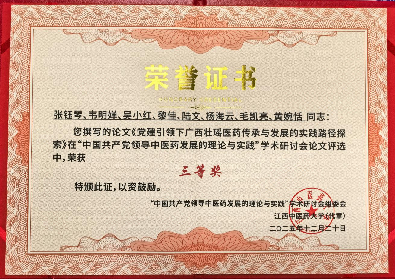 广西国际壮医医院机关第八党支部书记、《民族医药报》总编辑、院史馆馆长吴小红受邀参会,并在大会“中国共产党领导中医药发展的地区实践研究”分论坛中作主旨发言,《民族医药报》编辑部团队撰写的论文《党建引领下广西壮瑶医药传承与发展的实践路径探索》同步荣获大会论文三等奖。