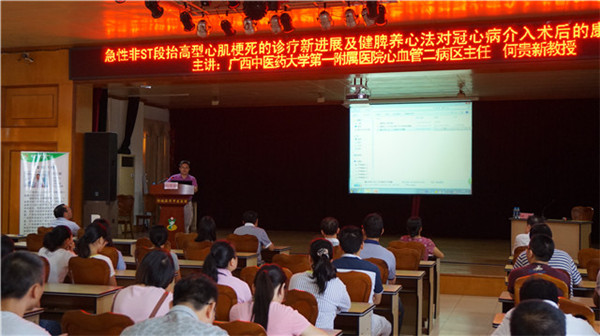 10月29日上午,在防城港市中医医院举行了广西名老中医钱海凌工作站的揭牌仪式。一附院钱海凌教授率专家团队何贵新、莫霄云、黄琛等6人、防城港市卫计委领导、防城港市中医医院领导及中层干部参加了此次揭牌仪式。仪式上防城港市中医医院徐奎院长致了欢迎词,市卫计委庞卫国副主任出席活动并做了重要讲话。随后钱海凌工作站专家团队开展了义诊活动,为防城港市近百名市民提供了中医诊疗与健康咨询服务,前来就诊咨询的病患络绎不绝。心血管内科二病区何贵新主任进行了“急性非ST段抬高型心肌梗死的诊疗新进展及健脾养心法对冠心病介入术后的康复治疗”的专题讲座,并做了冠心病介入手术示范,活跃了当地医院的学术氛围,带动了基层医院的学术发展。