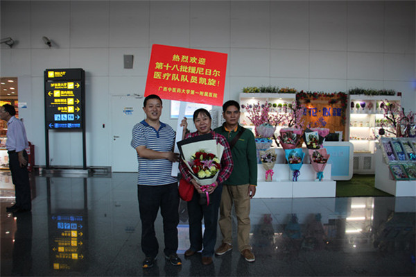 近日,由一附院选派的中国第18批援尼日尔医疗队队员圆满完成援外医疗任务,回到祖国、回到了家乡。受一附院党委书记李敏智、院长黄贵华等院领导的嘱托,人力资源部陈松林副主任代表一附院前往吴圩国际机场迎接麻醉科翟莉莉副主任医师,表达全院职工对一附院援非队员的慰问和敬意。