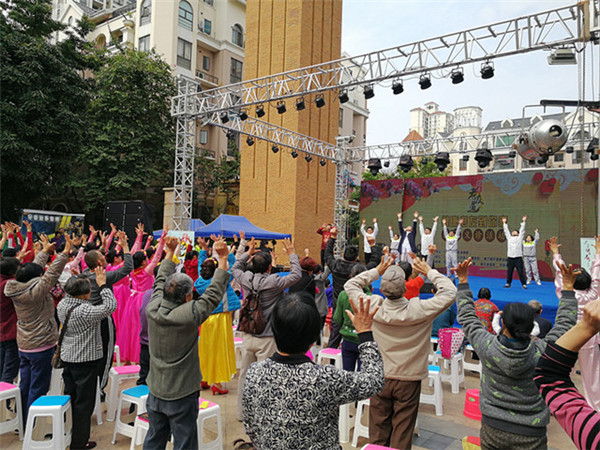 社区居民现场学习“华佗五禽戏”