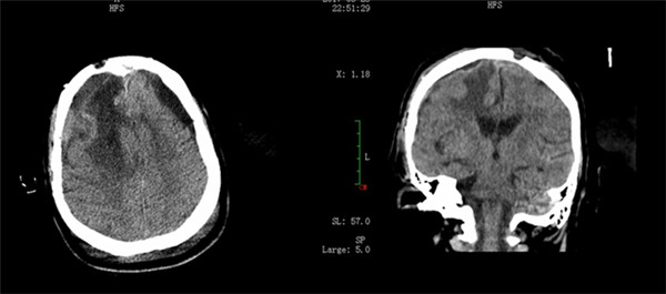 患者因“反复头晕10余年,加重并持续全身抽搐1天”由外院转入。入院诊断为:1.右侧大脑半球巨大脑肿瘤;2.继发性持续性癫痫;3.高血压病Ⅲ级,极高危组;4.Ⅱ型糖尿病;5.全身多处皮肤Ⅱ度烫伤。入院后主治医生迅速给予降颅内压、抗癫痫、控制血压、控制血糖及完善术前检查等抢救处理,但持续癫痫症状难以控制,患者病情十分危重,在使用硝普钠及多联降压药下血压还持续波动在200/100mmHg左右;胰岛素的用量已达80U/天,患者血糖水平仍固定在19mmol/L,病情明显迅速恶化,入院第三天,患者即出现嗅觉及右眼视力丧失、意识很快转入昏迷状态,四肢肌力0级,情况十分危急。