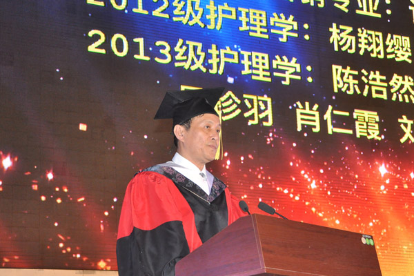 罗伟生在讲话中祝贺广大毕业生顺利毕业,同时向为同学们顺利完成学业付出辛勤劳动的广大教职工和家长们表示诚挚的敬意和衷心的感谢。希望毕业的同学们将院训精神内化于心,外化于行,做一个医德高尚,医术精湛的好医生。他嘱咐大家一是要心存梦想,勤于圆梦,将自己的梦想和伟大的“中国梦”结合起来,创造自己的人生价值。二是谨记在今后的工作岗位上要保持医者仁心,务当精诚、谦和、求实。三是以努力进取点燃生命之花,希望同学们以豁达的心态面对人生的起伏,以宽容的性情对待人生,始终充满自信、自强、自尊、自律,勇于攀登,勇于超越,铸造更辉煌的明天。