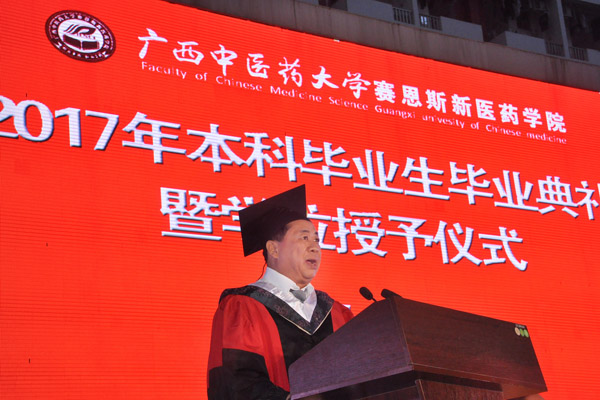 梁天坚祝贺同学们经过了几年的奋斗,取得了今天的硕果,并感谢同学们一直以来为学院的建设献计献策,为学院的发展做出的贡献。他希望同学们积极调整心态,继续发扬学院“明德自强和而不同”的精神,保持谦虚好学、吃苦耐劳的作风,勇敢的面对挫折和困难,尽快适应新的生活、新的环境和新的岗位,用你们勇于担当的气魄,去奋力追逐你们的青春梦想,去尽情挥洒你们的青春风采,为中医药事业做出积极的贡献。”