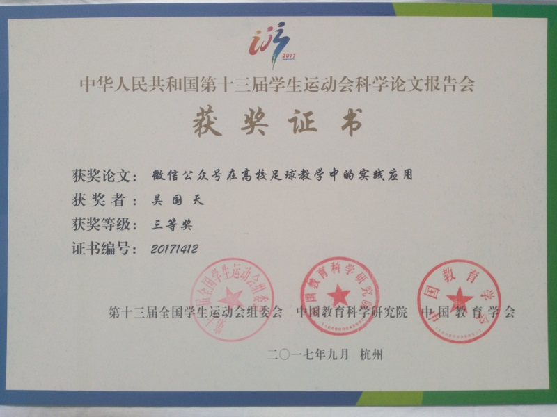 Beat365体育部教师报送的论文喜获第十三届全国学生运动会科学论文报告会三等奖