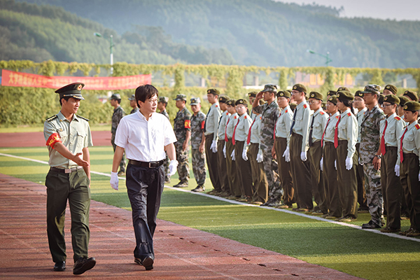 吴琪俊在带队教官的陪同下,检阅了赛院全体2017级军训新生,经过为期10天的军训,同学们口号嘹亮,站姿挺拔,表现出极高的精神素养。接下来的擒敌拳展示、花式和分列汇报表演纷纷获得了主席台上的领导和在场观众的一致好评。花式展示时,伴随着《国家》音乐的节奏,同学们用手语表达了自己的爱国情怀,接着同学们还摆出了“2017”、“赛院”和“列队倒计时”这些图案,充分表现了2017级新生对赛院的热爱以及对大学生活的美好向往。分列汇报时,30个连队迈着整齐有序的步伐、喊着嘹亮的口号、精神抖擞地走过主席台,展现了当代大学生朝气蓬勃、奋发向上的精神面貌。