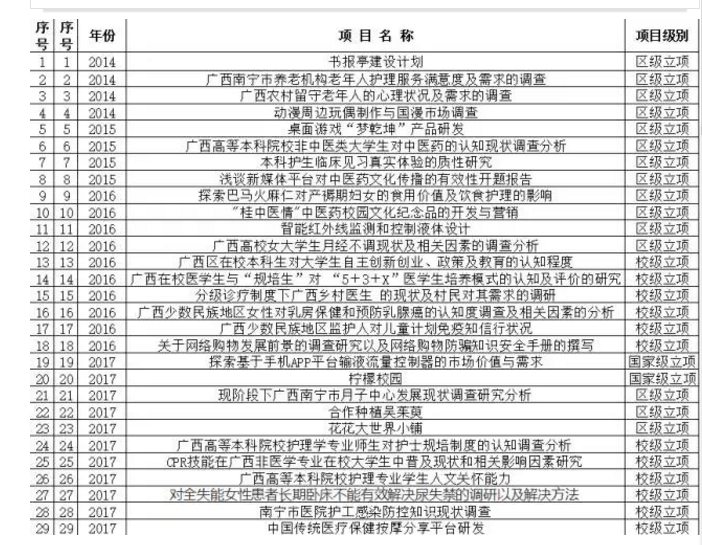 先后获得各类科技奖8项,获专利授权10项,2016年教师申请专利7项,学生申请专利1项(该项已于2017年获授权)。其中杨连招教授“护理教学实践中人文关怀教育的研究与实践”获中华护理学会科技奖三等奖,吕艳主任护师的“恒温灸具”获中华护理学会创新发明奖三等奖,李卫红教授的“从湿瘀论治子宫内膜异位症基础研究和临床应用”获广西科学技术进步奖三等奖,钟美容主任护师的“全程护理干预对提高冠心病介入治疗患者生活质量珠研究”获广西医药卫生适宜技术推广二等奖。