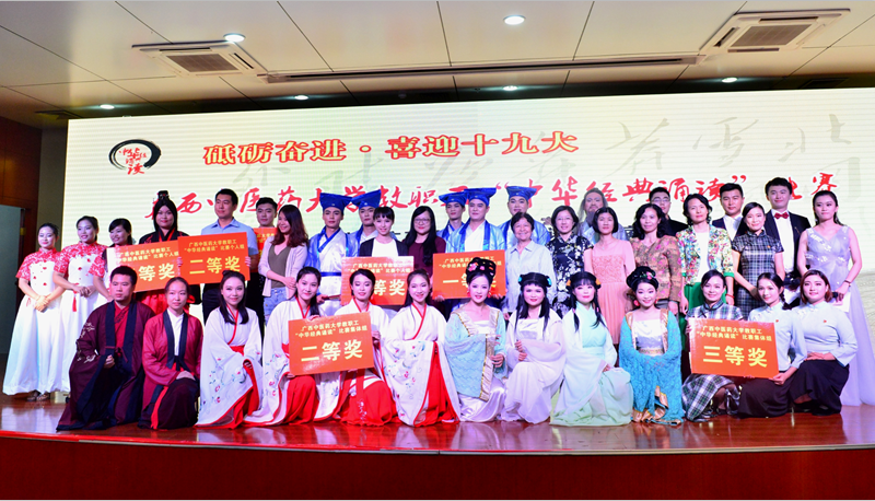 本次比赛分个人组和集体组进行,共有来自全校13个分工会选送的9个个人和10个集体节目参加了比赛。比赛评委由广西普通话培训测试中心监测员、国家级普通话测试员李莘;1003广西交通广播电台主持人千千;原学校党委副书记陈雪斌;学校党委宣传部部长周江煜;国家级普通话测试员、基础医学院陈晓林老师担任。参赛选手和单位对比赛给予了高度重视,从作品到背景音乐,从服装到舞台效果,都进行了精心地设计和充分地准备。在比赛中,伴随着或激昂或舒缓的音乐,《春江花夜月》、《祖国啊,我亲爱的祖国》、《丰碑》等经典诵读篇目在参赛选手们饱含深情地诵读中精彩呈现,将一段段优美的文字演绎为一幅幅生动优美的画卷、一曲曲动听婉转的歌谣和一幕幕催人泪下的场景,让现场观众沉浸其中,领略到了经典的魅力。为营造“读经典,学经典”校园文化氛围,全面测试选手综合素质,主办单位在比赛中还设置了综合文化素质问答环节,考察选手对经典国学知识的掌握程度和现场的应变能力、表达能力。与此同时,周江煜评委还对综合文化素质问答题中的知识点进行了解析,让现场观众在感受紧张激烈的比赛同时也一起品味了汉语的韵律、词章之美,感悟了祖国语言文学的无穷魅力,享受了一场精神与民族文化的饕餮盛宴。