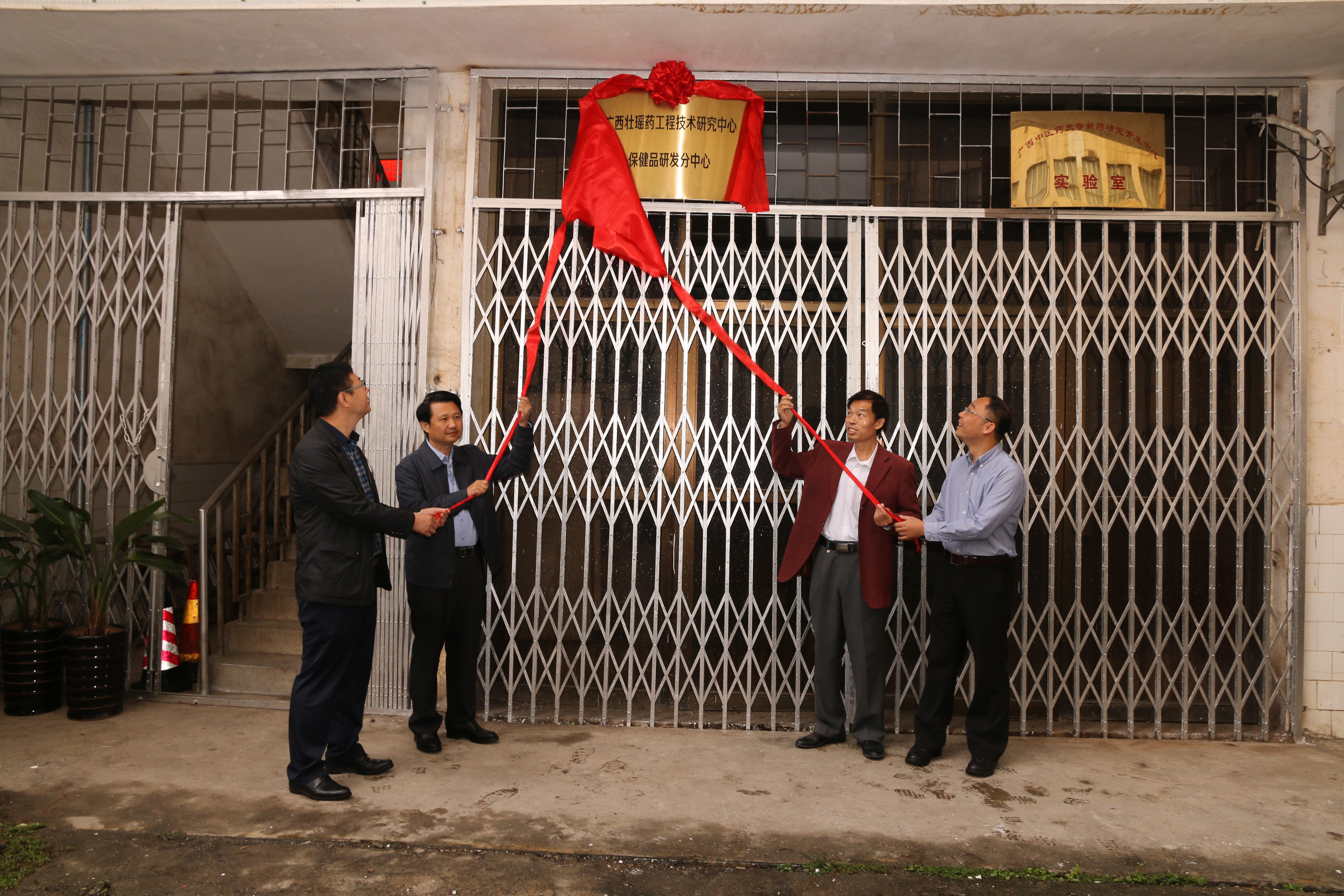 揭牌仪式上,庞宇舟、赵立春、何天富、陈洪涛为“广西壮瑶药工程技术研究中心保健品研发分中心 ” 揭牌。