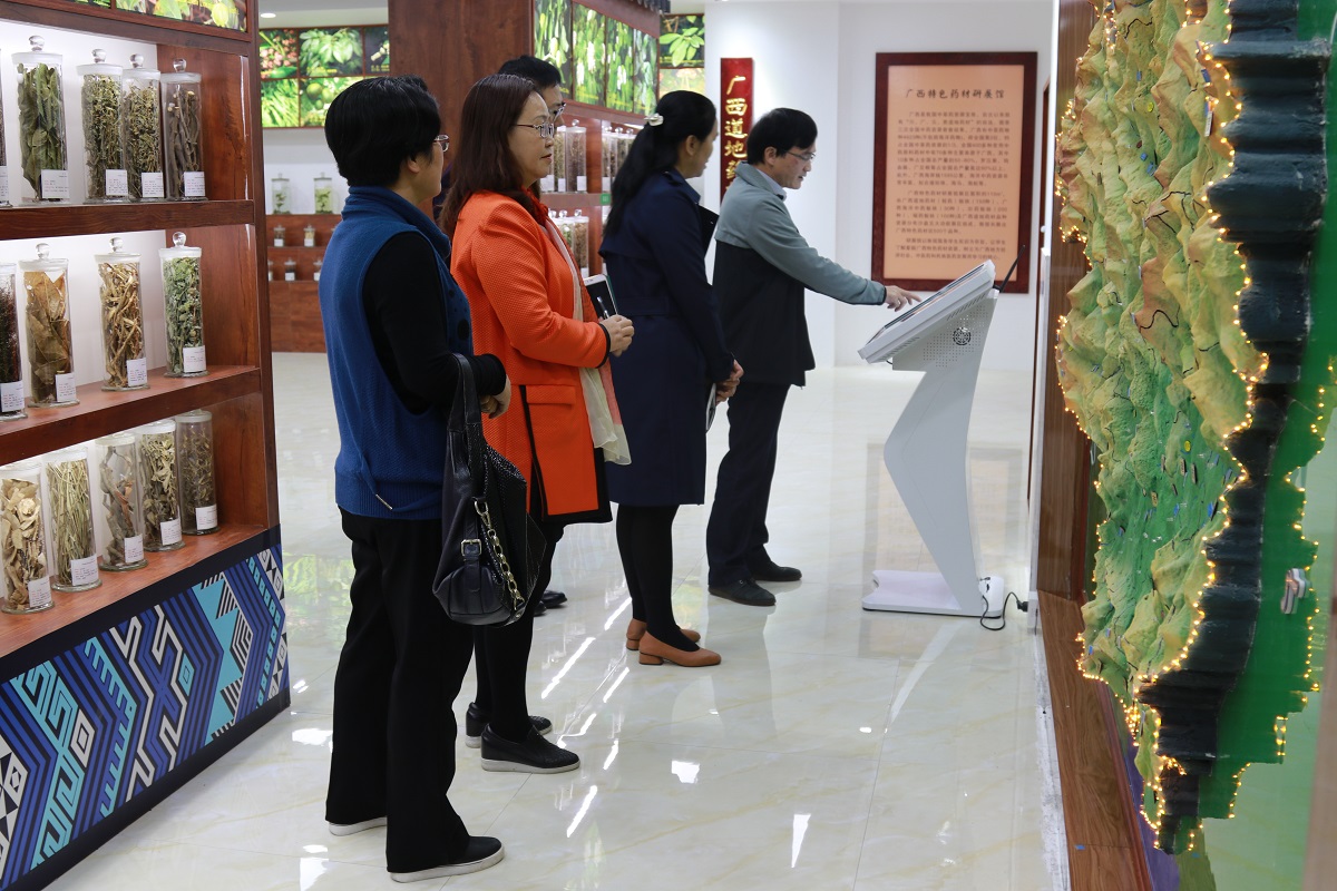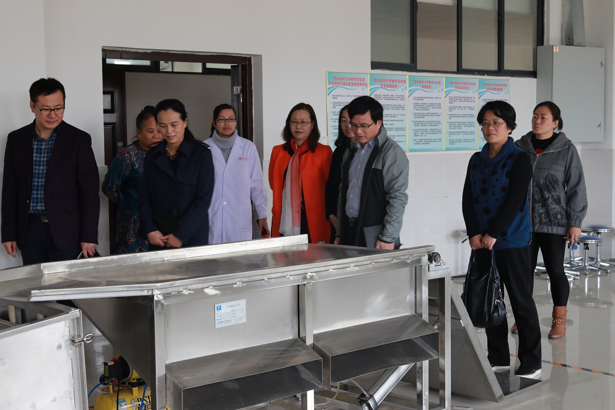 韦雪芳一行就药学院的概况、师资队伍现状、建设规划、建设成果等方面进行了深入了解,并参观了药学院的中药炮制实训中心、中医药辨识馆、腊叶标本馆、广西特色药材标本馆、现代中药制药工程中心等。