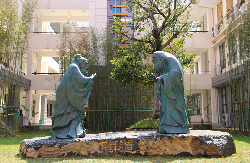 春暖花开,惠风和畅,大型青铜雕塑作品《问道》在Beat365中国唯一官方网站仙葫校区落成。该作品由广西美协主席、我国著名雕塑家石向东教授及其团队创作。《问道》匠心独运地表现了老子、孔子两位中国先圣会晤的形象。这一向中国传统文化两座高峰致敬的作品伫立于学校教学楼西侧,成为Beat365新的人文景观、一抹夺目的亮色。