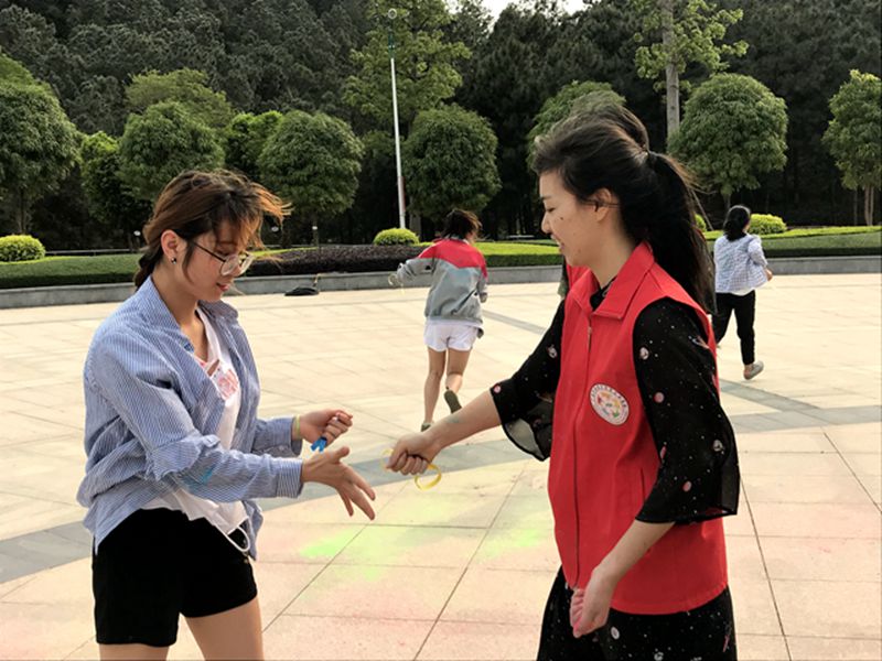4个彩虹站中的2号彩虹站的游戏是经典游戏石头剪子布,同学们情绪高涨,不少同学在只差一局就能成功时激动的大声喊出“石头、剪子、布!”为自己增强气势。在4号彩虹站的背夹球游戏处也是满满的欢声笑语,有的组配合默契,移动速度很快,也不会让球掉落,使得不少路过的同学驻足观看。游戏时,大家兴奋难抑,兴高采烈地把彩粉撒向天空,每一位参与者都被彩粉染得五彩斑斓,发自内心的笑容挂在每一个人的脸上,将赛道渲染成一条绚丽的彩虹。