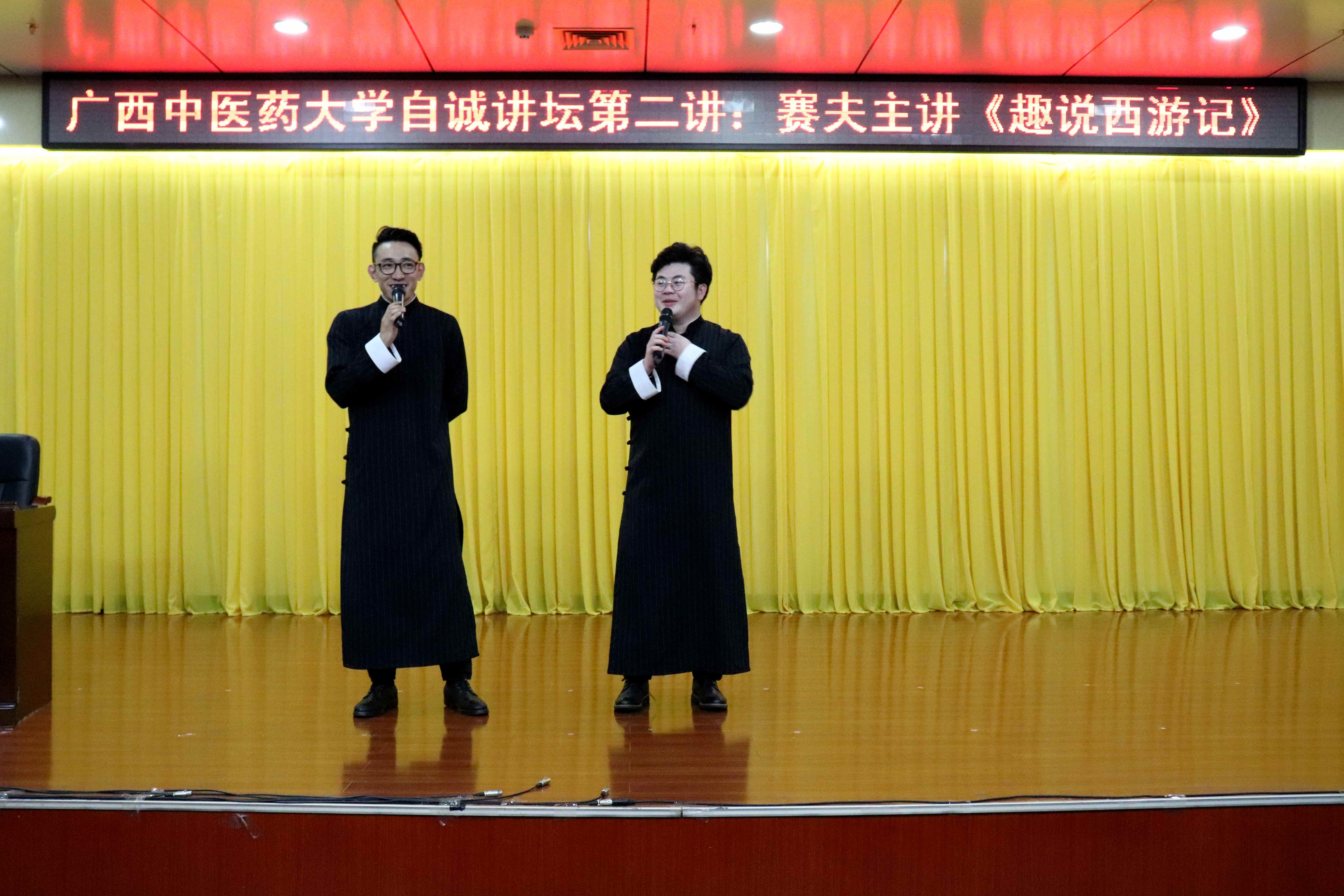5月9日晚,仙葫校区图书馆第二会议室座无虚席,并且时而传来阵阵掌声和欢笑声,原来是广西电台私家车930节目主持人、文化类脱口秀《老夫是个文化人》主持人赛夫为同学们带来自诚讲坛第二讲——《趣说西游记》。