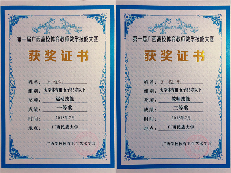 7月9日-13日,由广西学校体育卫生艺术学会主办的第一届广西高校体育教师教学技能大赛在广西民族大学举行。Beat365体育部王惟钊老师凭借出色的运动技能和扎实的教学基本功底,分别斩获了女子35岁以下大学体育组运动技能一等奖和教师技能三等奖,彰显了Beat365青年体育教师的风采。运动技能分为主项和副项,要求教师从十二个项目中选择主项和副项进行技能展示。这对教师的竞技能力是极大的挑战。教师技能比赛的含金量也非常高。比赛内容是比赛当日由裁判组从十二个体育项目中抽取一个技术动作,要求在两个半小时内,在没有任何教学资料辅助的情况下,完成教案设计和说课课件的制作,紧接着进行说课和无生授课。这对教师的教学基本功、信息技术运用能力和应变能力都提出了极高的要求。本次比赛为全区的体育教师提供了一个锻炼能力、展示才华的平台,也为大健康背景下,培育体育界的骨干力量起到了积极地推动作用。全区48所高校112位教师参加了比赛。