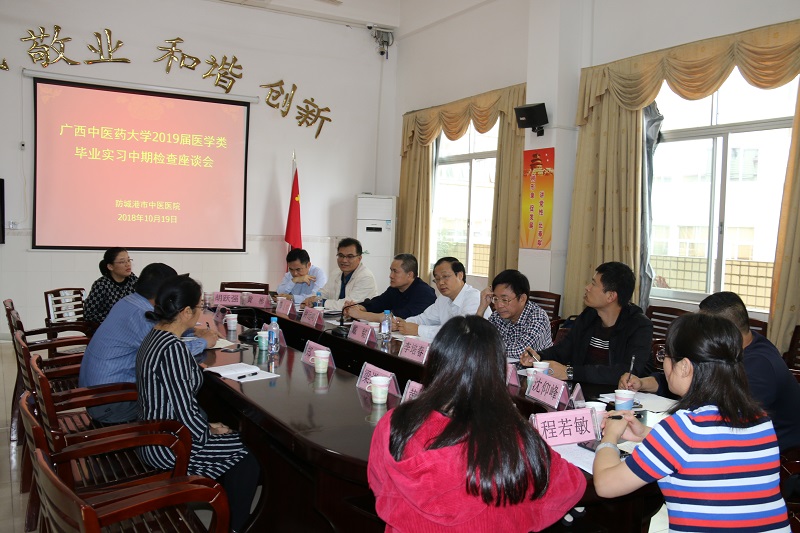 10月19日,学校副校长戴铭,副厅级调研员、督学组副组长李培春教授,教务处、第一附属医院等单位、部门领导一行13人对防城港市中医医院进行实习中期检查工作。
