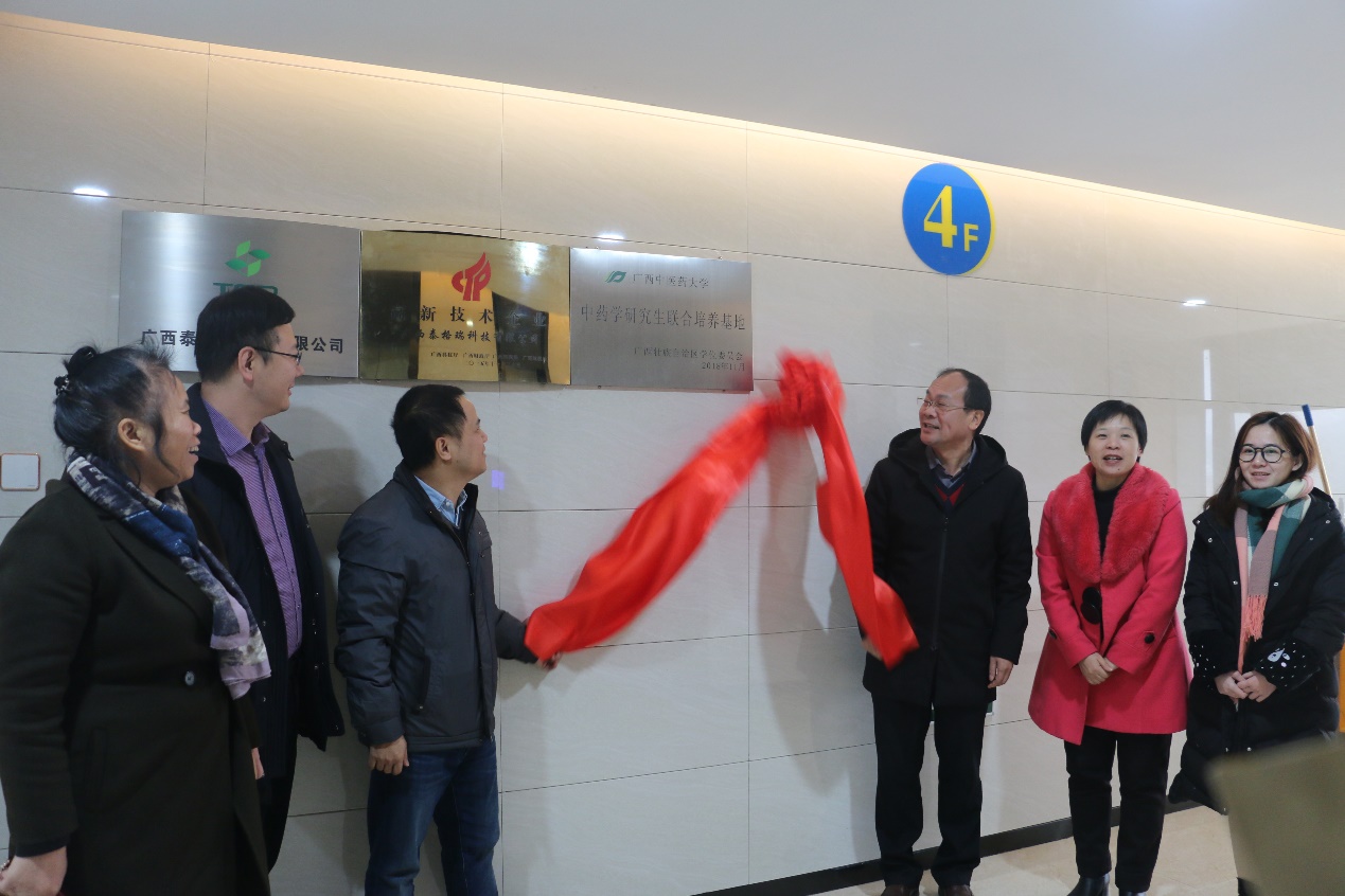 12月29日上午,Beat365研究生联合培养基地(中药学研究生联合培养基地)揭牌仪式在广西泰格瑞科技有限公司隆重举行。Beat365中国唯一官方网站药学院院长奉建芳、研究生处副处长易蔚、广西泰格瑞科技有限公司总经理梁俊等出席了活动。药学院常务副院长赵立春、药学院副院长卢汝梅、广西泰格瑞科技有限公司江漫等共同见证了这一喜庆的时刻。