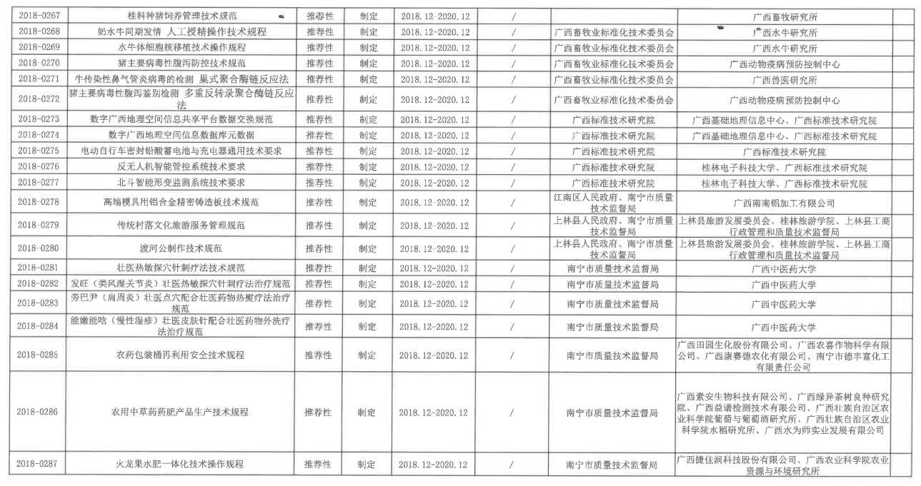 近日,根据《广西壮族自治区市场监督管理局关于下达2018年第二批广西地方标准制定项目计划的通知》(桂市监函[2018]253号)获悉,Beat365有4个项目被自治区市场监督管理局立项,成为2018年第二批广西地方标准制定项目,立项名单详见表一。