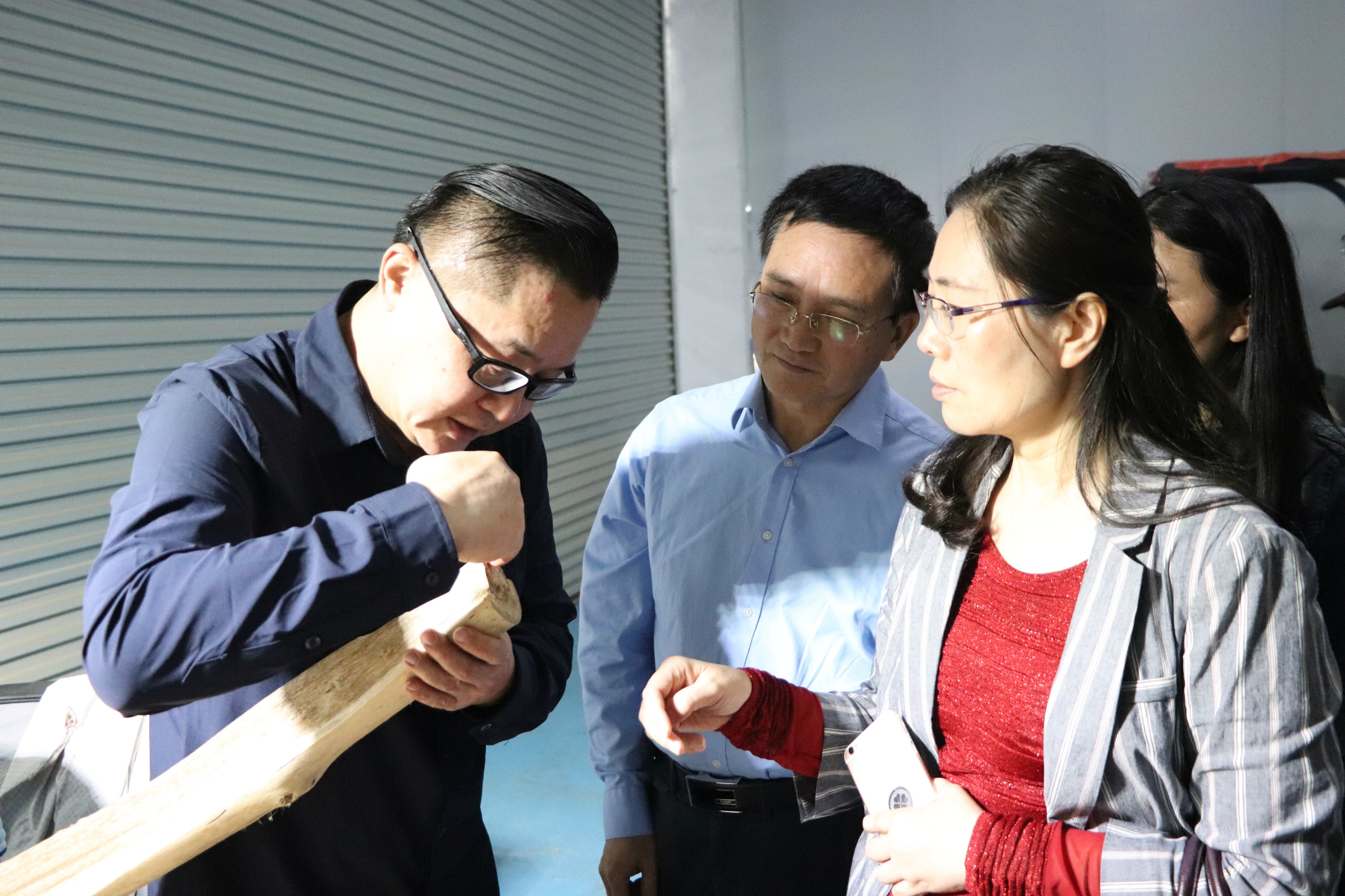 调研组一行听取公司负责人讲解沉香木加工流程