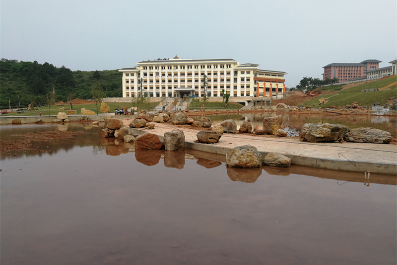 已经储水的阿平湖初现湖的形状,图书馆、自诚楼、教学管理中心、博物馆的倒影在波光粼粼中若隐若现;沿湖有规则地摆放着形状各异的石头,与随风飘拂的柳枝组成一幅幅优美的图画,绿意盎然,呈现出勃勃生机。