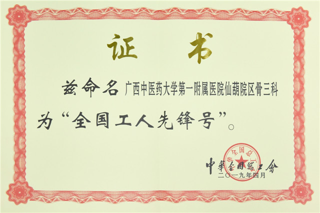 一附院仙葫院区骨三科是仙葫党总支第七党支部,同时也是“广西工人先锋号”优秀集体,科室秉承“以病人为中心”的服务宗旨,以创一流工作、一流服务、一流业绩、一流团队,积极开展“全国工人先锋号”创建,坚持科技引领、改革创新、联动攻坚,以优质、专业的技术服务尽心救助患者,赢得社会各界的赞誉,并在“5.1”前夕喜获“全国工人先锋号”荣誉称号。一附院也将以此为契机,坚定不移地弘扬工匠精神,涵养时代气质,在工作中比学赶超、奋发有为,让新时代劳模精神成为激励全院职工团结奋斗、干事创业的强大动力;坚持把模范精神与医疗业务相结合,积极展现良好的职业形象和精神风貌,为保障广大人民群众生命健康、建设壮美广西做出积极的贡献。