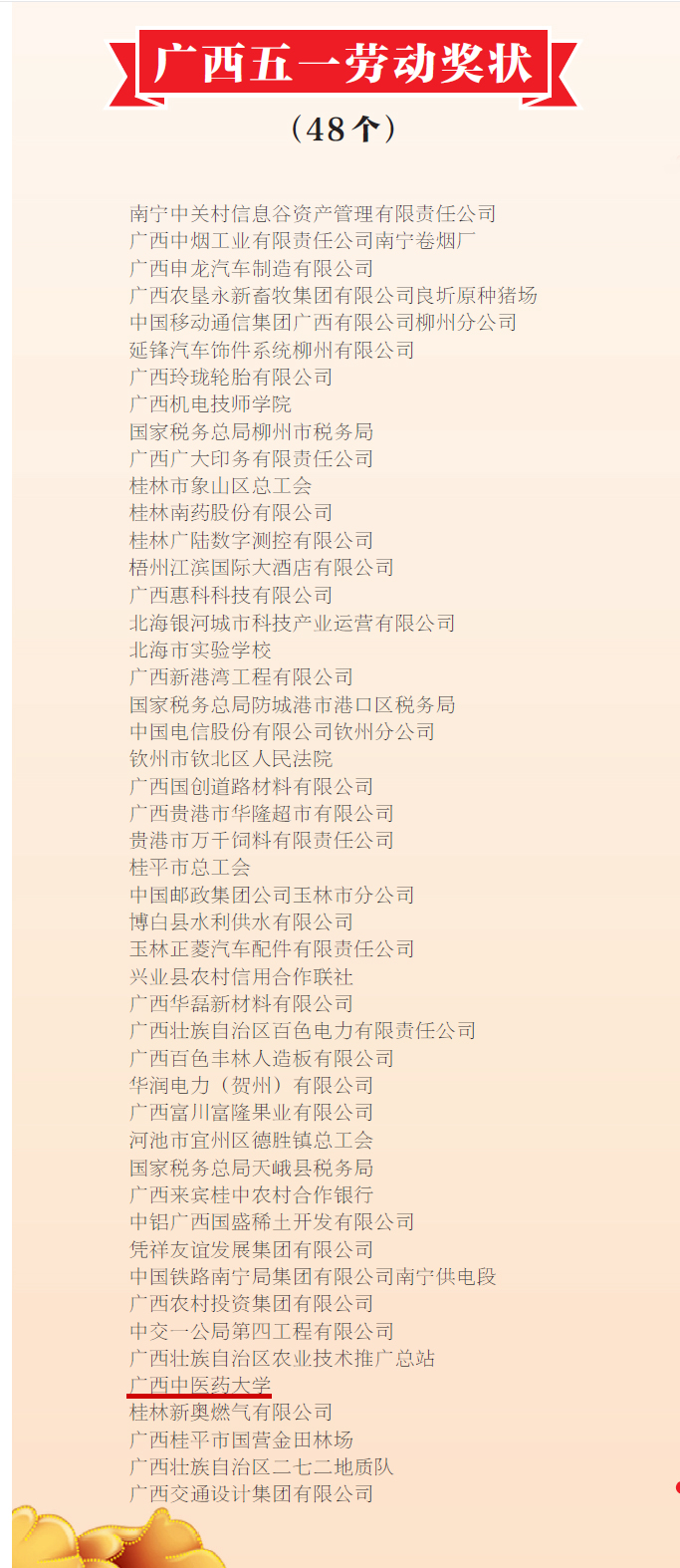 4月28日,庆祝“五一”国际劳动节暨广西五一劳动奖和广西工人先锋号表彰大会在南宁召开。自治区党委副书记孙大伟出席会议并讲话。会议宣读了有关表彰决定,并代全国总工会颁发了全国五一劳动奖状、奖章和全国工人先锋号奖牌,颁发了广西五一劳动奖状、奖章和广西工人先锋号奖牌。Beat365一附院仙葫院区骨三科荣获“全国工人先锋号”,学校荣获广西五一劳动奖状、药学院荣获广西工人先锋号,药学院林瑜、赛恩斯新医药学院白蕊、一附院唐爱存荣获广西五一劳动奖章。