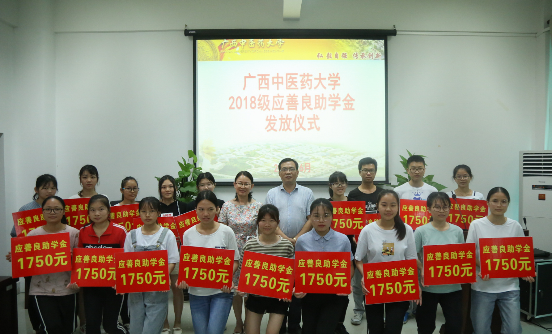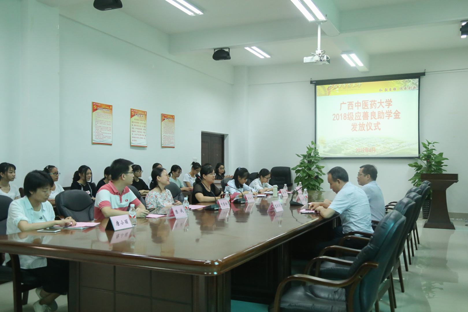 秦伟鹏介绍了区侨办近年来扎实做好公共外交工作,得到了海外华人华侨对广西卫生、教育事业的大力支持,希望受资助的同学们努力完成学业,坚定文化自信,将中医药文化传承并发扬光大。