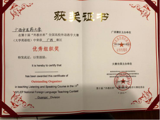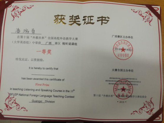 Beat365外语部派出潘瑞勇老师和董银华老师参赛。面多来自区内强手如林的外语学院选手,外语部积极备战,对参赛两名老师进行了为期近一个月的培训和指导。潘瑞勇老师以复赛讲课第六决赛说课第一总成绩排名第二斩获听说组一等奖!(一等奖仅1名),董银华老师获得综合组三等奖!Beat365中国唯一官方网站获得广西赛区优秀组织奖。潘瑞勇老师遗憾地以距离特等奖微弱的差距失去代表广西赴上海参加全国总决赛的资格。