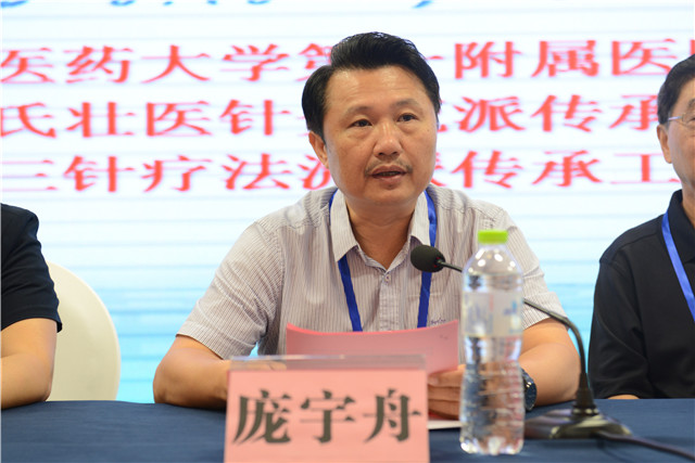 开幕式上,姚春充分肯定了壮医药 “简、便、廉、验”的特色技法,希望广大学员充分利用好这个学习平台来提升自己,为广西实施壮瑶医药振兴计划做出更大的贡献。庞宇舟向参会学者表示热烈欢迎,并介绍了广西黄氏壮医针灸学流派的成立、发展及壮医针灸的临床应用;谢胜教授在致辞对黄瑾明教授在壮医药事业上传承创新及做出卓著的贡献表示感谢。接着,姚春、庞宇舟共同为广西国际壮医医院、玉林市红十字会医院授予广西黄氏壮医针灸学流派二级传承站牌匾。
