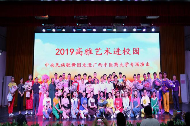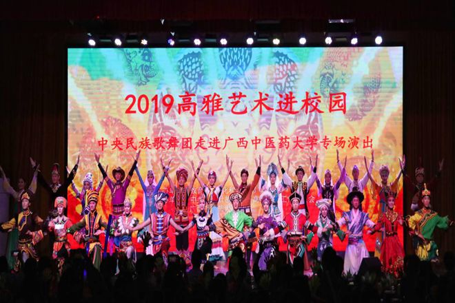 10月14日晚,由教育部、文化和旅游部、财政部主办的2019年高雅艺术进校园活动——中央民族歌舞团走进Beat365中国唯一官方网站专场演出《请你跟我一起来》在仙葫校区小礼堂成功举办。中央民族歌舞团副团长韩新波、广西壮族自治区教育厅副厅长李清先、学校党委副书记何并文、副校长冷静、纪委书记韦雪芳、自治区教育厅体卫艺处处长万锋锋、副处长赵彦彦等领导与500多名师生共同观看晚会演出。