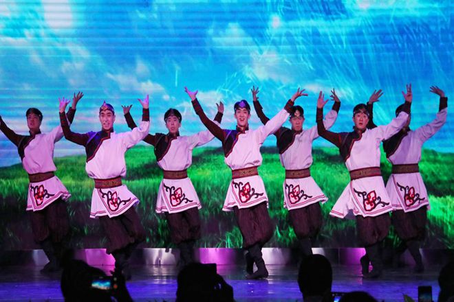 演出在《快乐舞步》中拉开序幕,几十位艺术家身着各民族华丽服饰,以独具民族特色的舞姿,描绘出一幅各民族和谐共处,其乐融融的和谐景象,得到全场热烈掌声。紧接着由张铎的乐器独奏蒙古族马头琴《万马奔腾》体现了草原的辽阔和蒙古族人的热情奔放,二月半组合的《不忘初心》、李雪的女声独唱《歌飞天下》,国家一级演员慕林林倾情演唱的《为祖国干杯》《妈妈的话》以及其他少数民族演唱家带来的经典民歌,婉转悠扬,给师生留下难忘深刻的印象。群舞《蒙古组合展示》《打歌打舞》《骏马归来》展现了少数民族奔放豪迈的性格。努尔艾力带来的热瓦普弹奏《欢乐的春天》展现的是传统器乐独特的魅力;由国家一级演员蓝剑演唱的《共产党人》使同学们在歌声中领略到共产党人的无私奉献精神,使全场沸腾,并将晚会推向高潮。最后由激情洋溢的舞蹈《青春之歌》拉下晚会的帷幕。